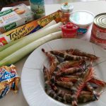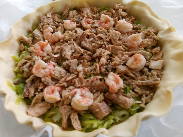 Zet alle ingrediënten klaar. Snijd de prei over de lengte in tweeën. Was de prei. Snijd de halve preien in smalle halve ringetjes. Laat de zalm uitlekken in een zeef en pluk uit elkaar met behulp van een vork. Pel de garnalen, verwijder het darmkanaal en blancheer een paar minuten in kokend water.