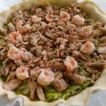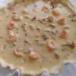 Klop in een kop de eieren, eidooier, kurkuma en de crème fraîche tot een gladde massa. Breng op smaak met zout en piment d'espelette. Verdeel dit mengsel over het prei-, zalm- en garnalenmengsel.