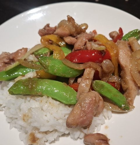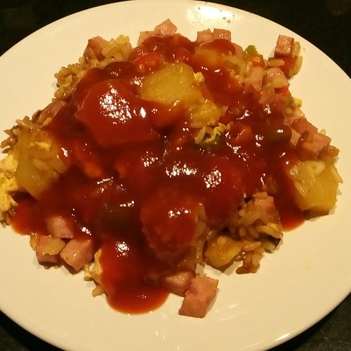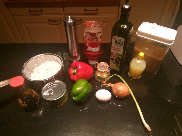 Zet alle ingrediënten klaar. Pel en snipper de ui. Maak de paprika's schoon en snijd deze in blokjes. Snijd de ananasschijven in stukjes. Kook de rijst 's-morgens of gebruik een restje rijst van een eerder gerecht. Snij de lente ui in ringetjes.