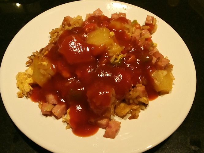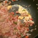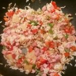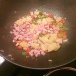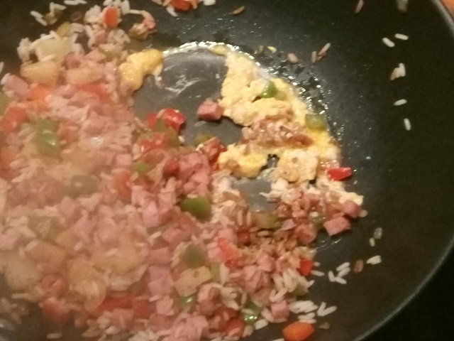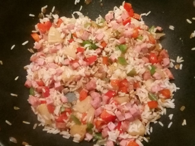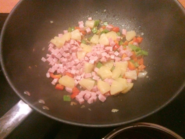 Voeg de hamblokjes en de ananasstukjes toe en bak deze 2-3 minuten mee. Meng alles goed door elkaar met een pollepel.