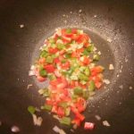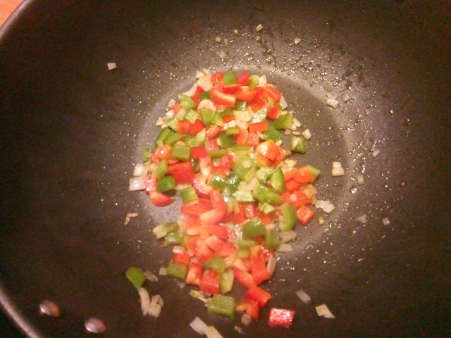 Verhit in een wok de olie en fruit de ui tot deze glazig ziet. Voeg dan de paprikastukjes toe. Bak deze tot ze wat zachter zijn.