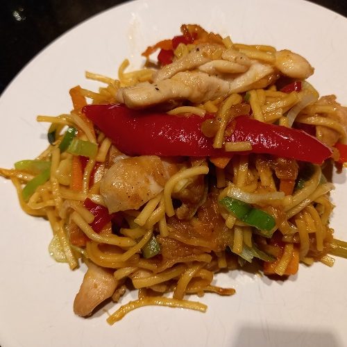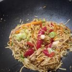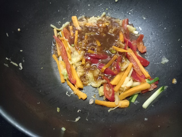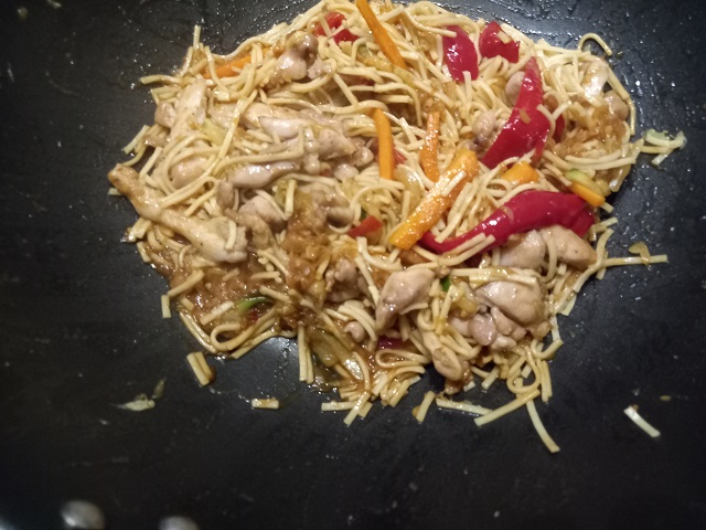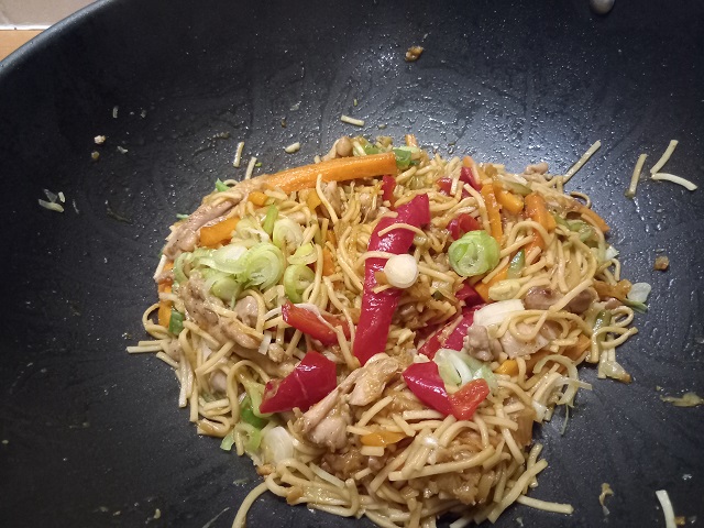 Voeg ook de noedels en de saus toe. Meng goed door elkaar. Ga nog een minuut of 2 door met roerbakken onder voortdurend omscheppen zodat de saus alle ingrediënten coat.