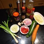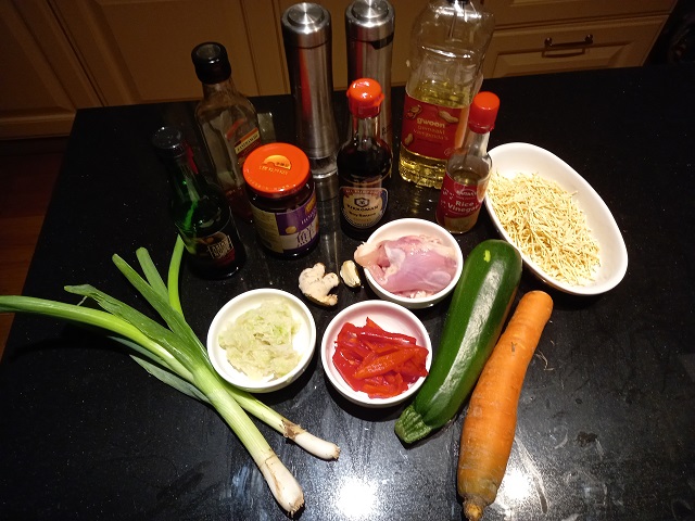 Zet alle ingrediënten klaar en snijd de groenten en kip.