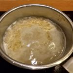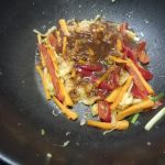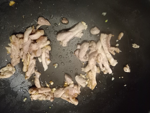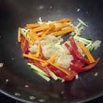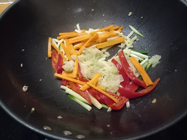 Voeg zout, peper, geraspte gember en knoflook toe en bak deze een minuutje mee. Haal uit de pan en bewaar op een bordje. Laat zoveel mogelijk olie in de wok.