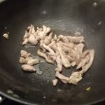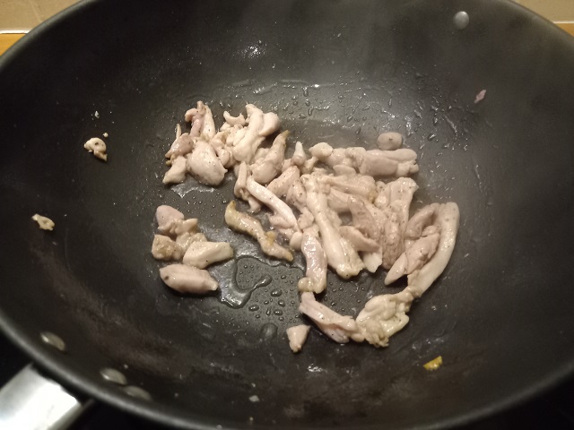 Verhit in een wok de olie en bak de kipreepjes aan alle kanten tot ze licht bruin zijn.