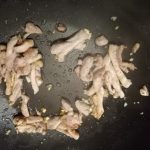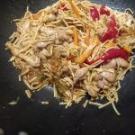 Voeg de gebakken kipreepjes toe aan de groenten.
