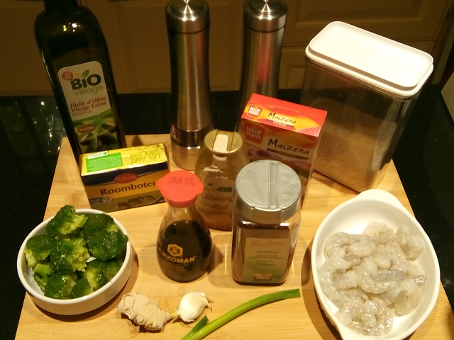 3. Gebruik ⅓ van dit mengsel om de garnalen mee te marineren. Zet de garnalen weg in de koelkast en laat minimaal 30 minuten marineren. Maak intussen de broccoli schoon en snijd deze in roosjes. Kook de broccoli een paar minuten maar niet gaar. Ze moet knapperig blijven. Kook de rijst volgens aanwijzingen op de verpakking.