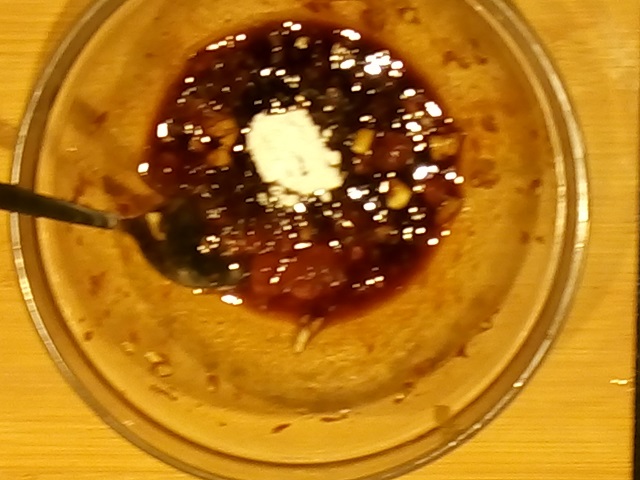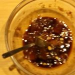 2. Meng in een kom de honing, sojasaus, gember, knoflook, chilivlokken en meng goed door elkaar.