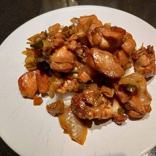 Verdeel de rijst over de borden en schep hier de kip met groenten over.