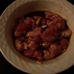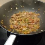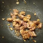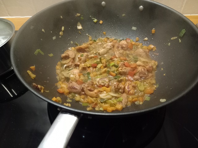 2. Voeg de kipblokjes toe en meng goed door elkaar.