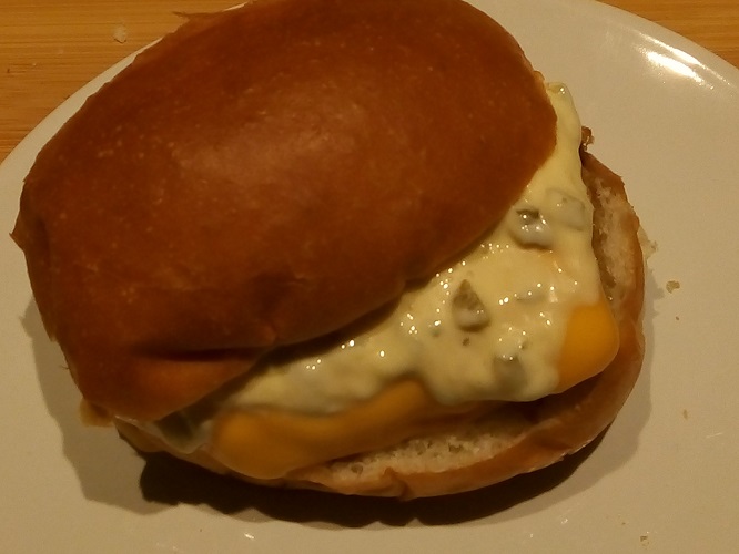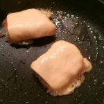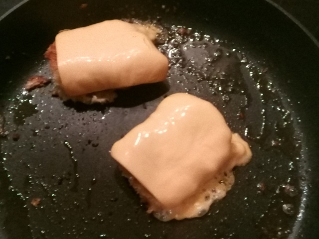 Haal de pan van de warmtebron en leg op beide burgers een plakje Cheddar. Deze zal door de restwarmte in de pan smelten.
