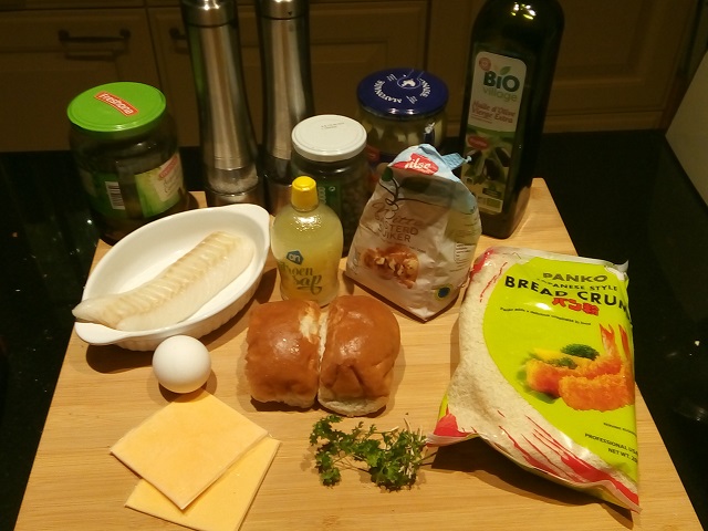 Meng alle ingrediënten voor het beslag. Doe de panko in een bord. Snij de vis ongeveer ter grootte van de broodjes.