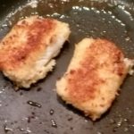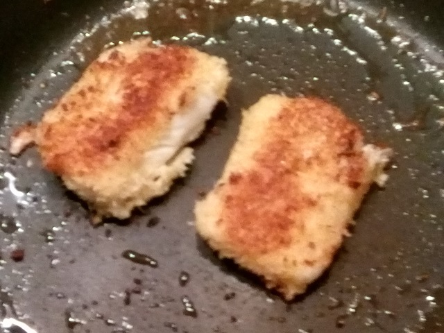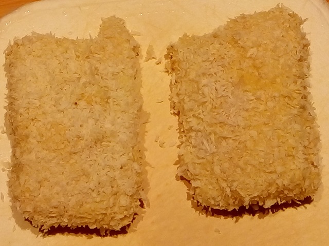 Dompel met 1 hand een stuk vis in het beslag en wentel deze door het pankokruim. Druk goed aan met de andere hand. Leg weg op een bordje. Doe hetzelfde met het andere stukje vis.