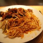 Roer de pasta en de helft van de Parmezaanse kaas door de kalfsriblappenstoof. Breng eventueel op smaak met wat zout en versgemalen peper.