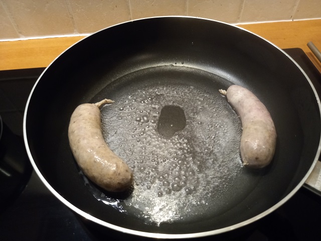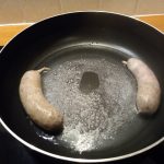 2. Leg de worstje in een hapjespan en voeg 60 ml water toe. Verhit op middelhoog vuur. Zet het deksel schuin op de pan en kook de worstjes tot het water verdampt is. Draai regelmatig om.