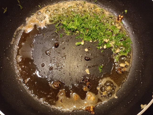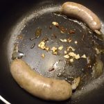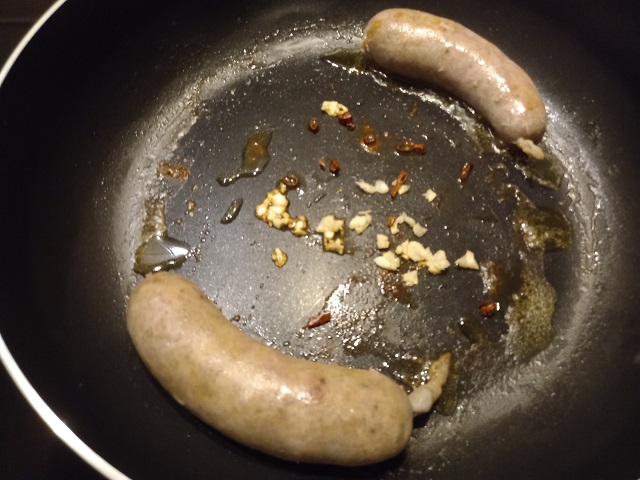 4. Zodra het water is verdampt voeg de olijfolie, de helft van de knoflook en eventueel de chilivlokken toe. Bak voor een paar minuten en draai de worstjes regelmatig. Ris de tijmblaadjes van de takjes en pluk de peterselie van de takjes. Snijd fijn.