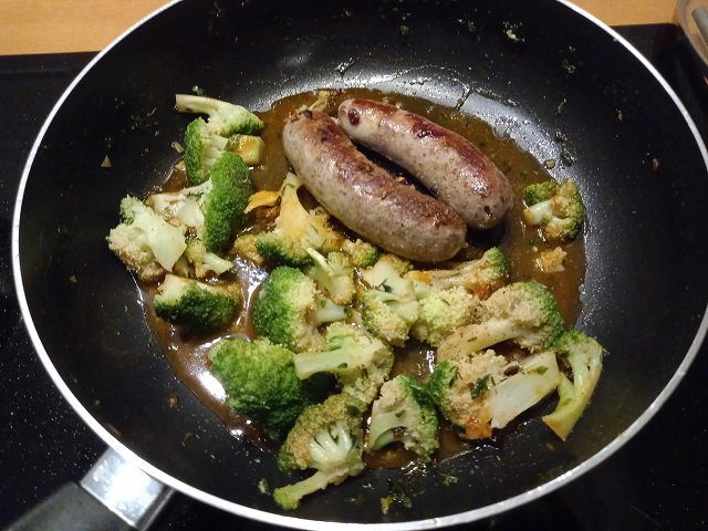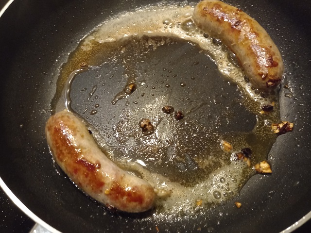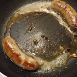 5. Voeg de boter toe en bak nog een paar minuten. Haal de worstjes uit de pan en bewaar onder aluminiumfolie.