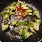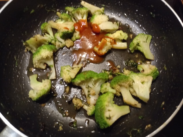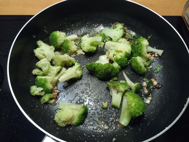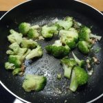 7. Voeg de geblancheerde broccoliroosjes toe en roerbak deze een minuut of 5