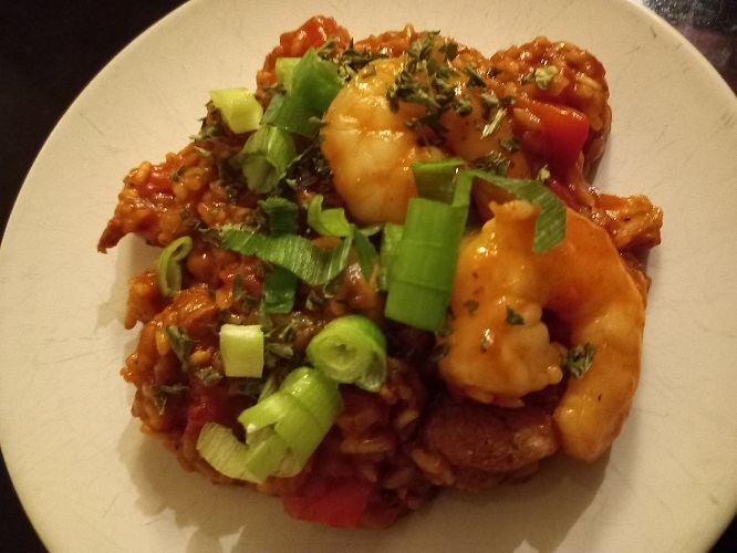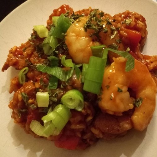 Dit 1-pans jambalaya recept is eenvoudig, heerlijk en bevredigend dankzij de toevoeging van kip, garnalen en saucijs.