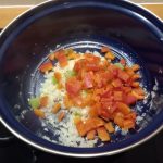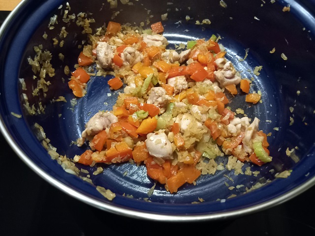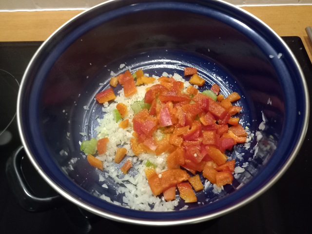 Verhit in een braadpan de olie. Voeg de ui, bleekselderij, en paprika toe. Kruid met wat peper en zout. Bak tot de paprika wat zachter is geworden (ong. 4 minuten) voeg dan de knoflook toe en bak nog 1 minuut.