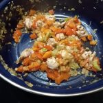 Voeg de kip, paprikapoeder en oregano toe. Bak een 5 minuten of dat de kip aan alle kanten gekleurd is.