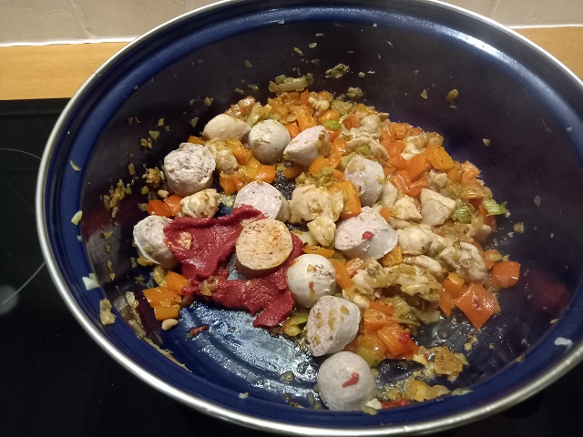 Voeg de plakjes saucijs en de tomatenpuree toe. roer goed door elkaar. Bak gedurende 1 minuut zodat de tomatenpuree kan ontzuren.