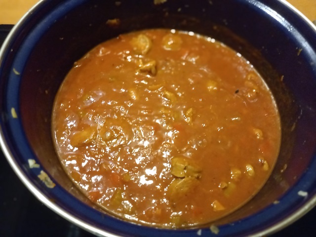Voeg de bouillon, tomatenblokjes, rijst en Cajun kruiden toe. Breng het geheel aan de kook, zet dan het vuur wat lager en doe het deksel op de pan. Laat een minuut of 20 zachtjes koken. Roer regelmatig door.