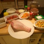 Zet een braadpan met een scheut olijolie op hoog vuur en braad de kalkoenpoot aan en alle zijden. Voeg paprikapoeder, kurkuma, koriander, zout en peper toe. Laat even meebakken zodat ze hun smaak kunnen afgeven. Zet het vuur lager, doe het deksel op de pan en laat rustig gaar stoven.