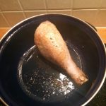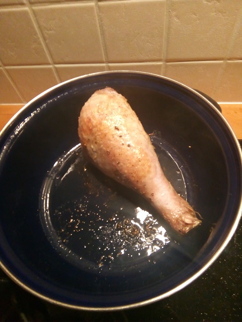 Haal de kalkoenpoot uit de pan en snijd het vlees van het bot. -