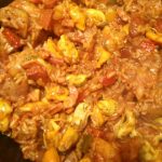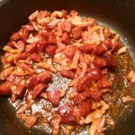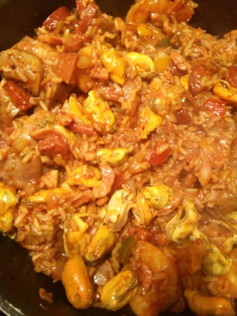 Als de rijst gaar is voeg dan de scampi’s, chorizo en spekjes toe.
