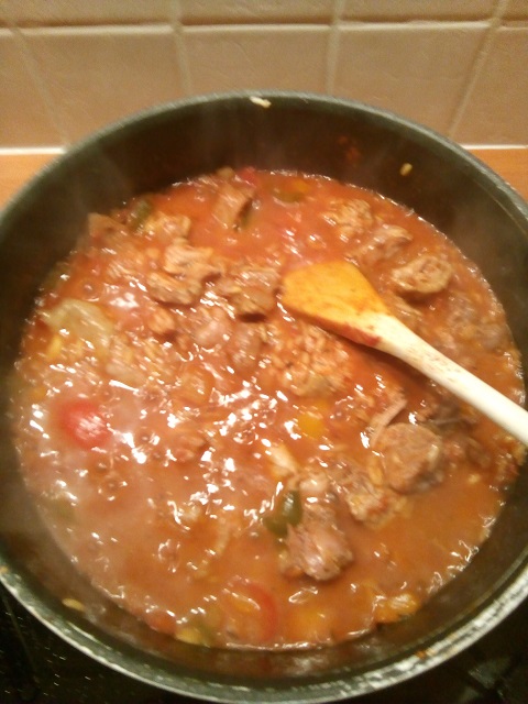 Snijd het vlees klein en voeg toe aan de jambalaya.