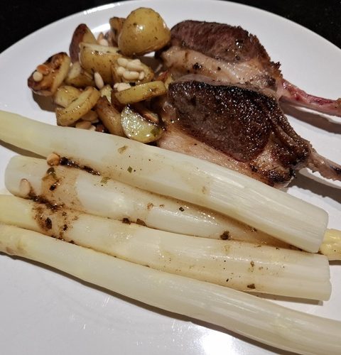 Verhit in een hapjespan een scheutje olie en bak hierin de spekjes en de chorizoblokjes. Schep ze uit de pan en bewaar ze. Bak de scampi’s aan beide zijden. Voeg eventueel een scheutje olie toe. Haal ze uit de pan en bewaar.