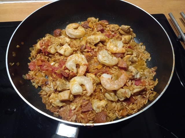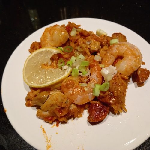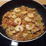 Zodra de rijst gaar is voeg dan de garnalen toe. Doe het deksel weer op de pan. Zodra de garnalen mooi roze gekleurd zijn is het gerecht klaar. Verdeel over de borden en garneer met de lente ui en een plakje citroen.