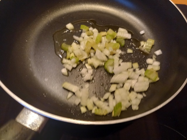 Verhit de olie in een hapjespan. Voeg de ui, de bleekselderij en een snufje zout toe. Laat een paar minuten bakken tot de ui glazig is. Voeg de knoflook toe en laat nog 1 minuutje meebakken.