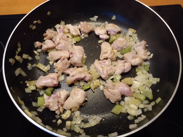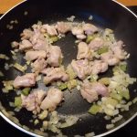 Voeg de kipbokjes toe en bak deze tot ze om en om aangebraden zijn.
