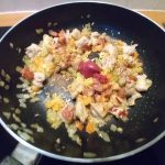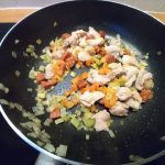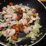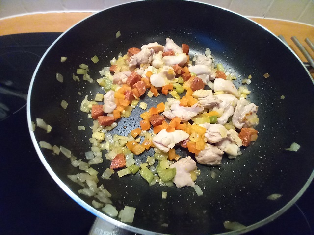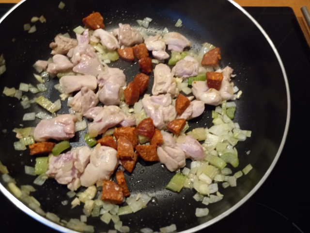 Voeg dan de chorizo en bak deze een paar minuten mee.