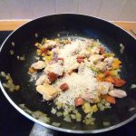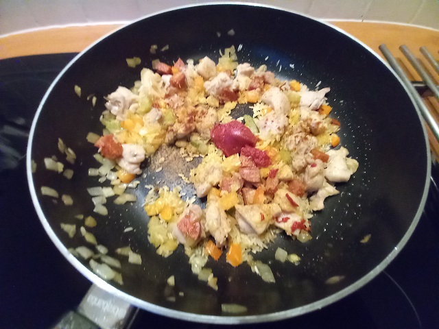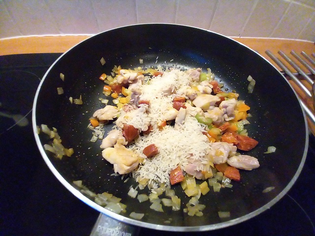 Voeg nu de rijst toe. Meng het geheel door elkaar en laat de rijst even meebakken.