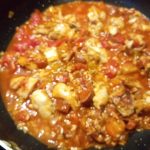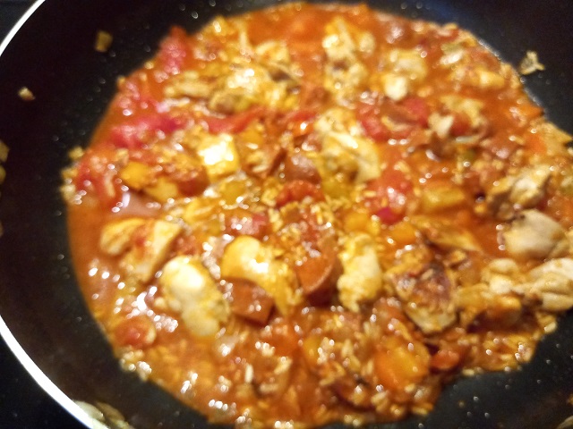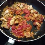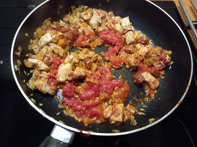 Voeg nu de tomatenblokjes en 350 ml van de kippenbouillon toe en roer goed door elkaar. Breng aan de kook. Zodra de bouillon kookt zet dan de warmtebron wat lager. Zet het deksel op de pan en laat ongeveer 20 minuten zachtjes koken.