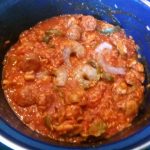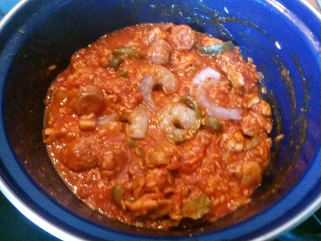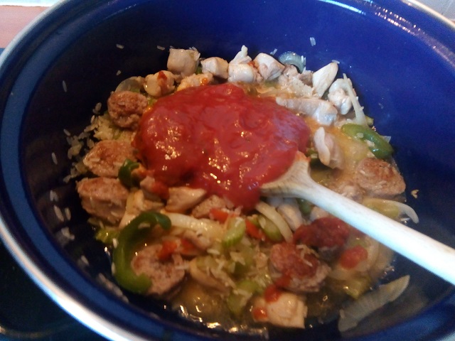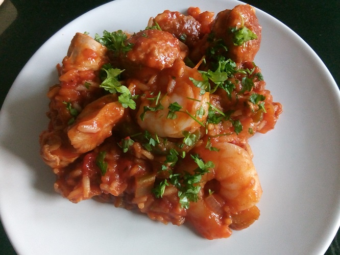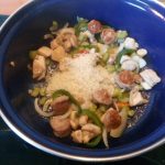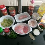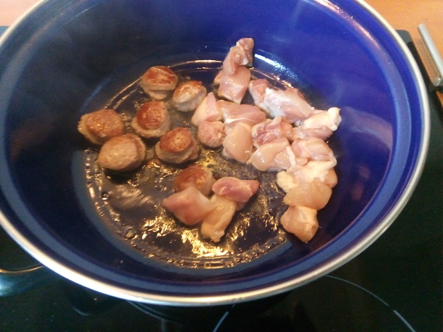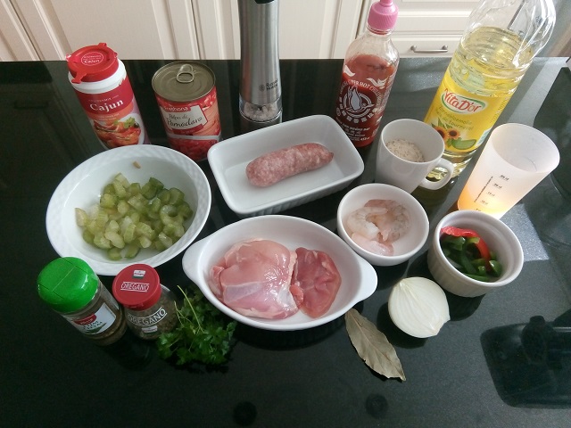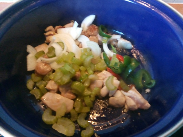 Zet alle ingrediënten klaar. Snijd de saucijs in plakjes van ongeveer 1 cm. dik. Snijd de kippendij in blokjes. Snijd de paprika in reepjes. Pel en snijd de ui in halve ringen. Snijd de bleekselderij in stukjes. Pluk de blaadjes peterselie van de takjes en snijd deze grof.
