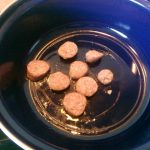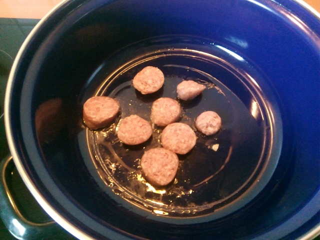 Verhit de olie in een braadpan. Voeg de plakjes saucijs toe en bak deze mooi bruin aan.