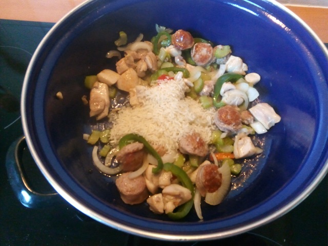 Voeg de ongekookte rijst toe en laat deze even meebakken.