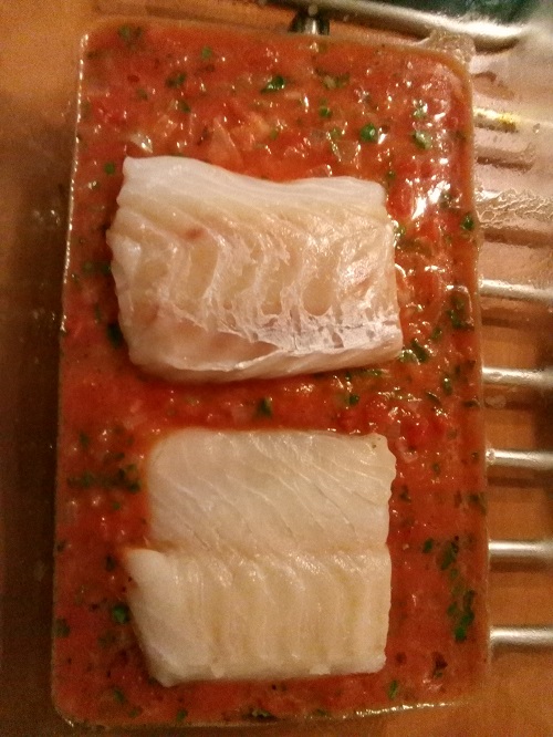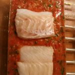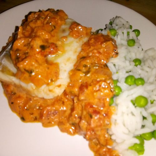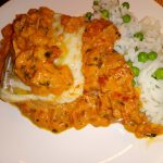 4. Verdeel de kabeljauw over de borden en giet er de saus over. Ik serveerde er witte rijst met wat doperwten bij.