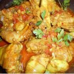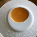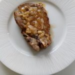 Giet wat saus over de borden. Leg de kabeljauwfilets erop en giet dan nog wat saus over de vis. Ik at er doperwtjes met worteltjes bij.