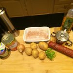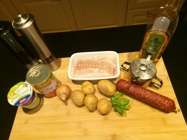 Zet alle ingrediënten klaar. Pel en snipper de ui. Snijd de chorizo in de lengte door. Snijd de 2 helften nogmaals in de lengte door en snijd er dan stukjes van. Schil de aardappelen en snijd ze in niet al grote stukken. Snijd de gepelde tomaten in blokjes.