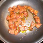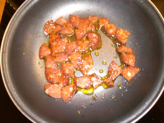 Bak de chorizostukjes zachtjes in wat olie. Voeg de crème fraîche toe.