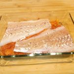 Doe de inhoud van de pan in een ovenschaal en leg de kabeljauwfilets hier op. Bestrooi met wat zout en peper. Zet de schaal in de oven en laat ongeveer 12 à 15 minuten garen, afhankelijk van de dikte van de kabeljauw.