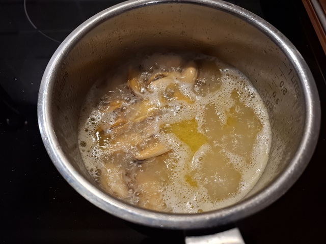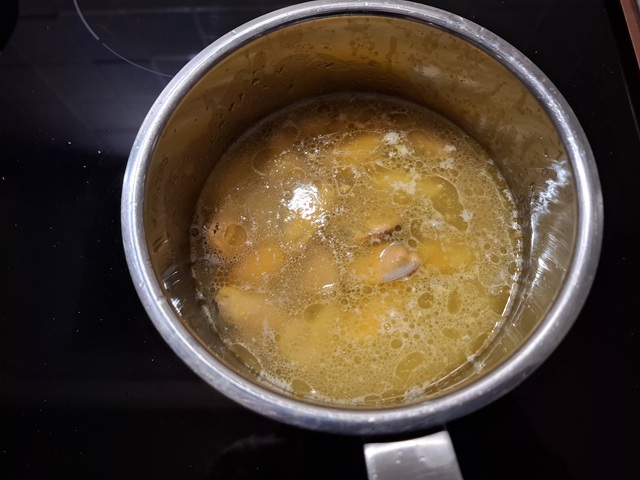 Laat de boter smelten in een steelpannetje en voeg de mosselen toe.