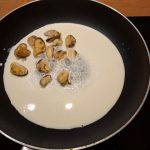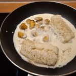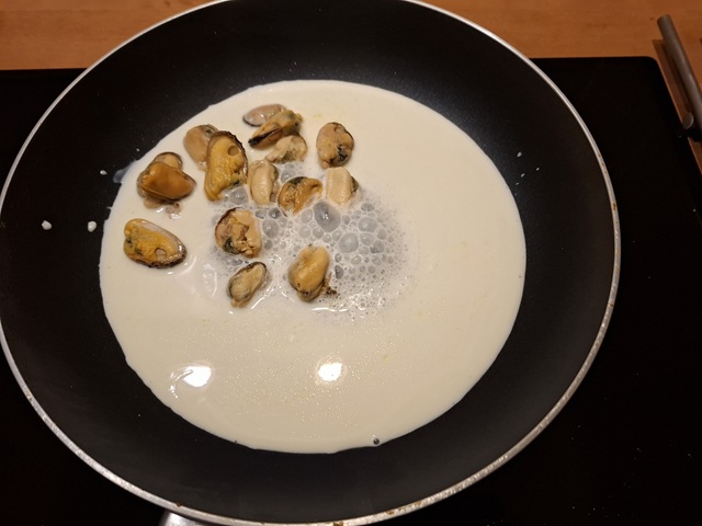 Breng de kookroom aan de kook in een koekenpan en voeg de mosselen toe.