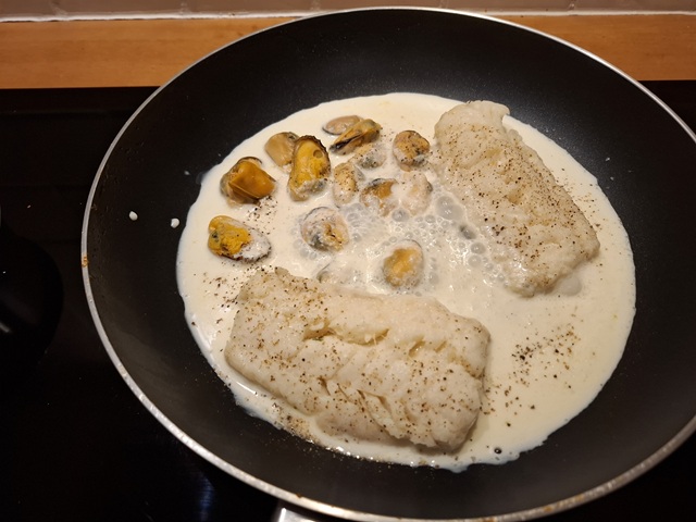 Voeg de kabeljauw toe en voeg wat zout en peper toe. Laat 5 minuten zachtjes doorwarmen. Verdeel de vis, mosselen en de saus over de borden. Geef er (basmati) rijst bij.