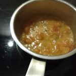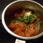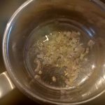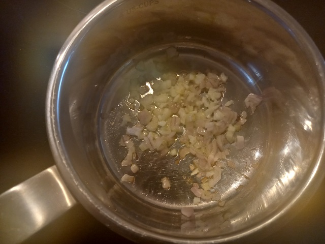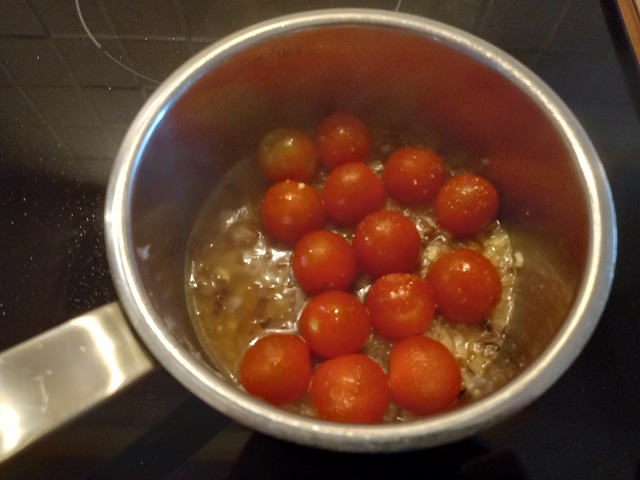 Terwijl de kabeljauw in de oven staat verhit de el. olijfolie in een steelpan en fruit de sjalot gedurende een minuut of 4-5. Voeg op het laatst de knoflook toe.